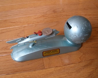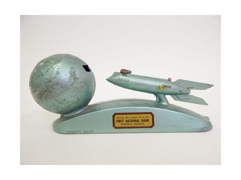Vintage space age mechanical for sale as shown in actual pic. Strato bank clearwater federal savings mechanical bank in box we have for you a zinc alloy boxed mechanical strato bank made for clearwater federal savings and loan association of clearwater, florida and manufactured by duro mold & manufacturing inc. Just lay the coin in front of the airplane and push the little red piece down to launch the coin into the moon. Created to be distributed as a premium by local commercial banks, the strato included a place for an adhesive sticker advertising the gifting institution. Strato bank by duro 1953 (modified 1961 & 1962 as commemoratives) the destination moon bank by duro, 1959.